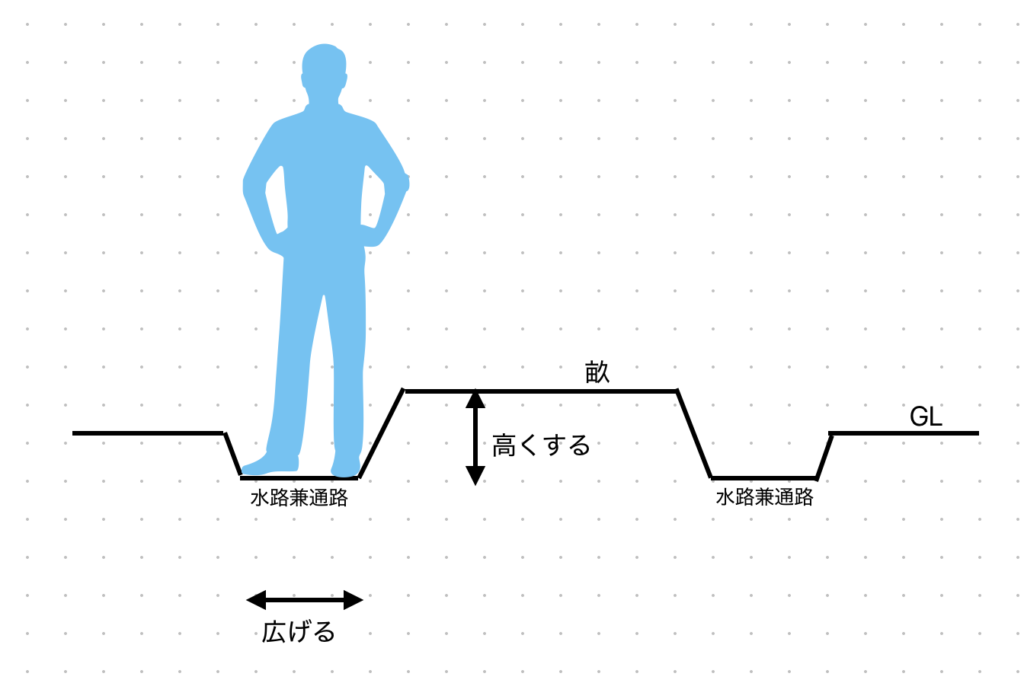 通路を掘り下げ、畝を高くしてヒザ下あたりの高さに畝を調整し、さらに畝を2本から3本へ増設して畝幅を狭める(手が届く)計画に変更しました。