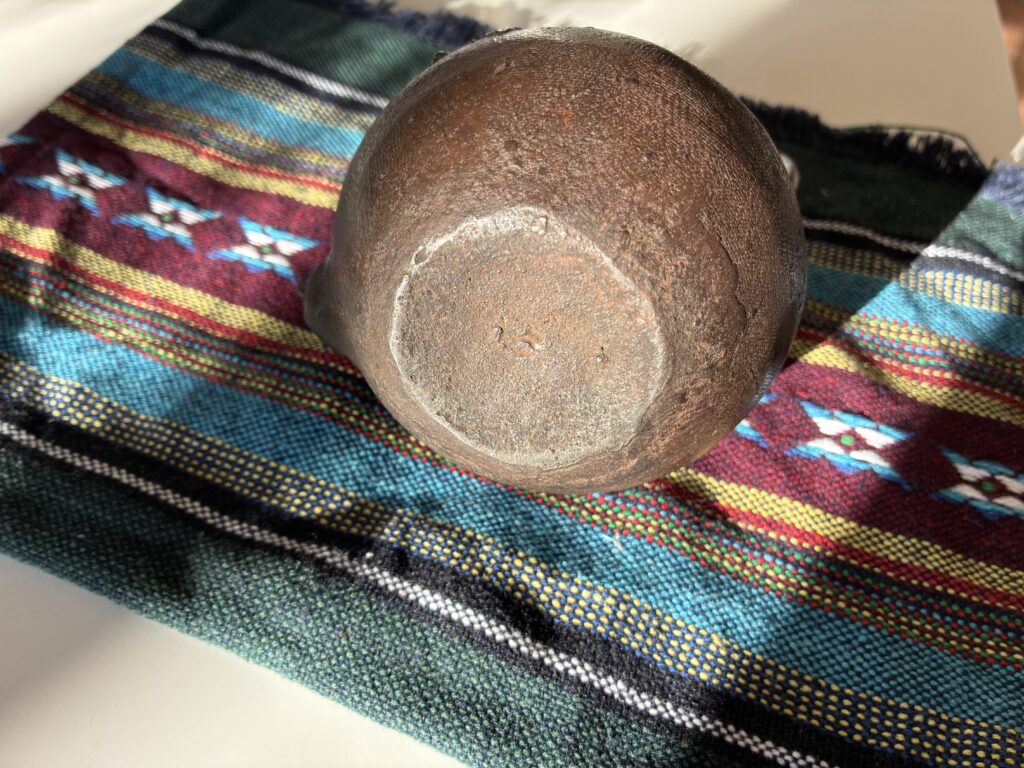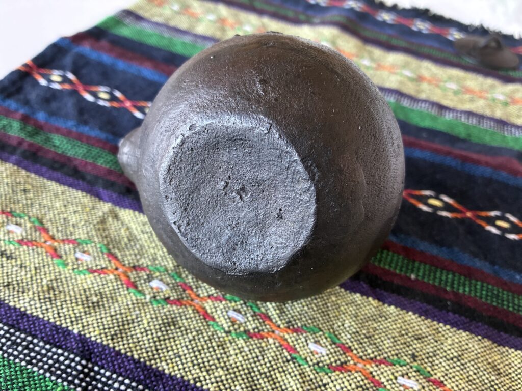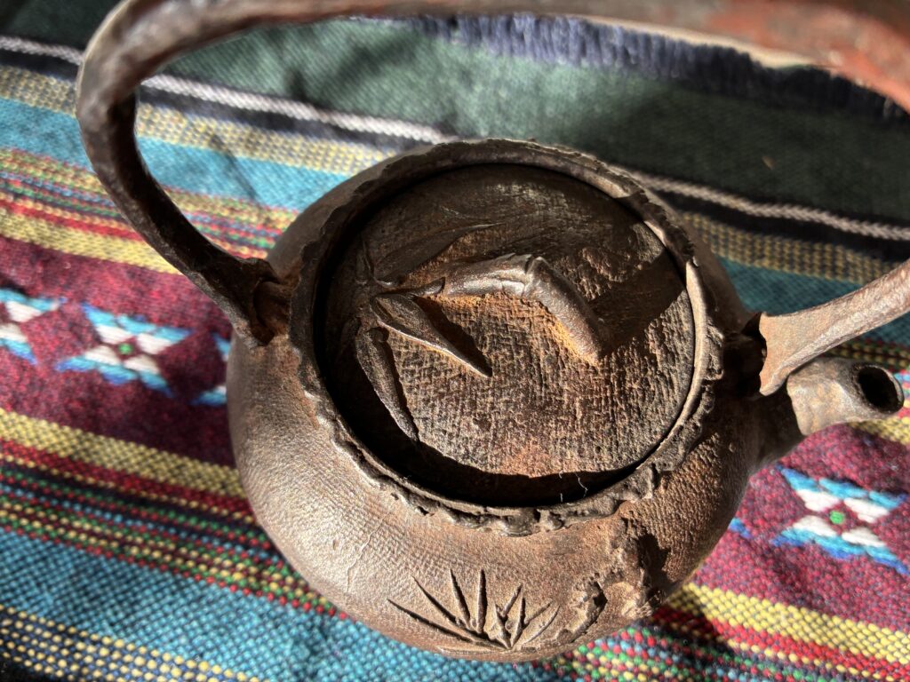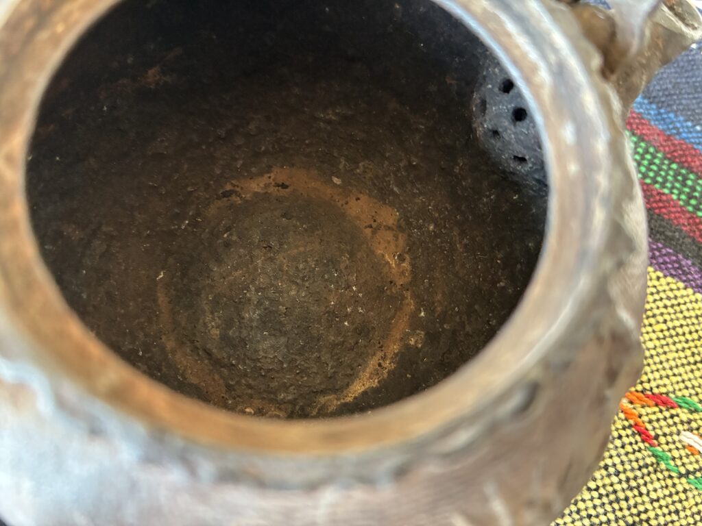 鉄瓶が熱いうちに、外側にも真っ黒なタンニン液を何度もかけたのですが、この鉄瓶は黒くならずに備前焼のような色合いです。こんなところが明治の文人に愛されたのかもしれません。
